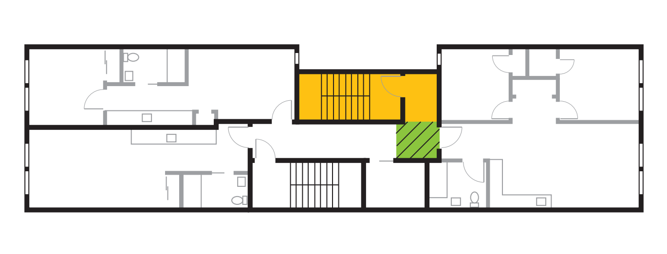 Despite the questionable effect on fire safety outcomes, North America’s unusual second stair requirements have an outsized impact on the design of multifamily buildings. The rules make it almost impossible to efficiently recreate the traditional design of apartment buildings, termed “point access blocks” by Seattle architect Michael Eliason—a few units around a single stair, with maybe an elevator. The common hallway that must connect the two stairs in a modern American code-compliant building cuts the structure in two, cutting off the possibility of floor-through apartments found in traditional American multifamily architecture like the New York City tenement or the Los Angeles dingbat.