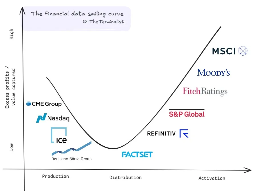 At the heart of this transformation is what The Terminalist calls the "invisible curve" framework—a model that divides the data ecosystem into three distinct stages, each creating value in different ways. The first stage, production, encompasses the creation of raw data at its source. In financial markets, exchanges like the NYSE and Nasdaq generate the primary building blocks: transaction data, order book information, and market activity. These producers literally own the source of truth—the record of what actually happened in the market.