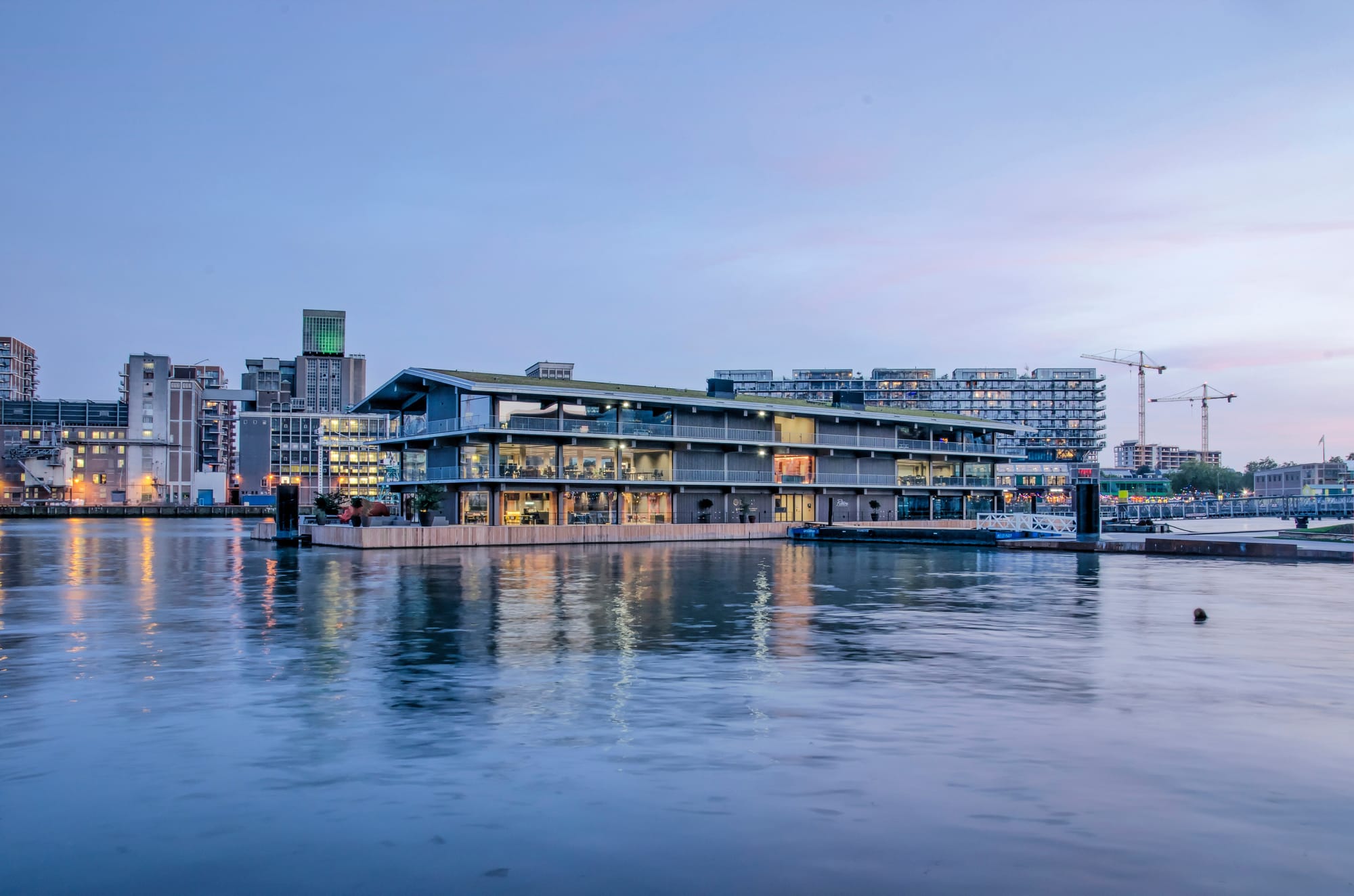 A floating office property, which rests on 15 concrete barges in the Rijnhaven, a former industrial harbour on the Maas River, is innovative from a design perspective alone, but it’s the synthesis of form, function, and sustainability that makes the property a remarkable achievement. Constructed out of timber, in order to be light enough to float and to minimize its carbon footprint, the property achieves carbon neutrality through a roof filled with solar panels and by harnessing the water upon which it resides to support a passive cooling and heating system. Powerhouse were the architects on the project.