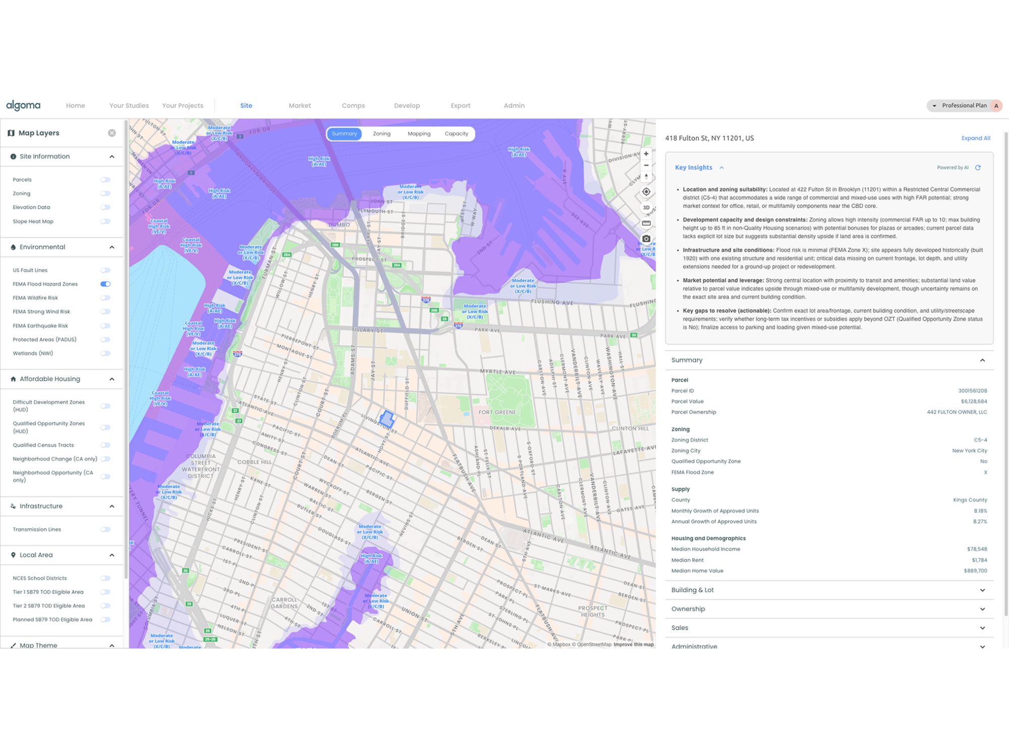 A number of tools are tackling individual steps of the analysis, such as underwriting or massing studies. But a new generation of platforms are looking to automate the entire feasibility analysis process, potentially changing how developers find and analyze sites. Algoma, backed last year by construction technology investor Zacua Ventures, is taking that holistic approach.
