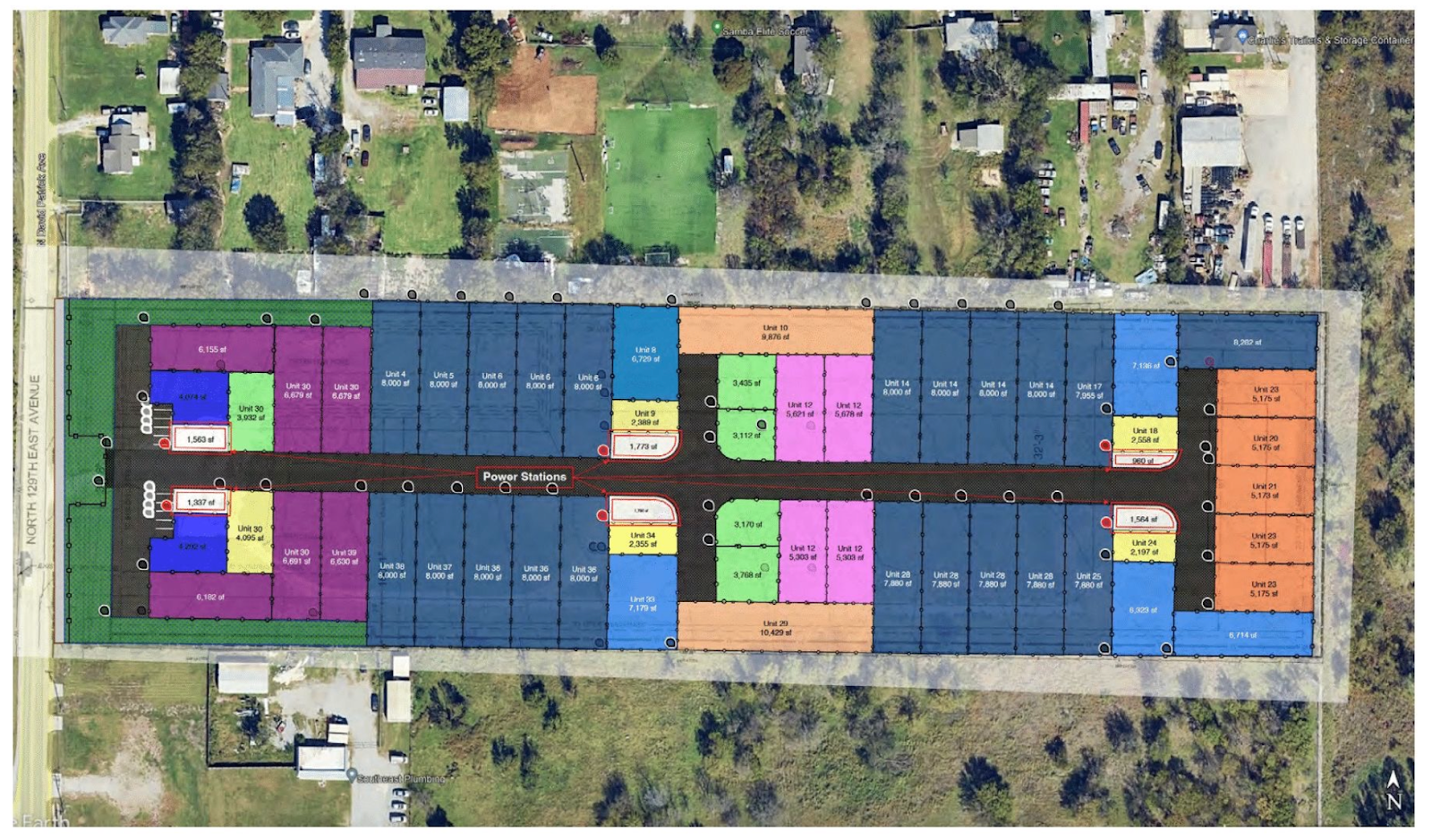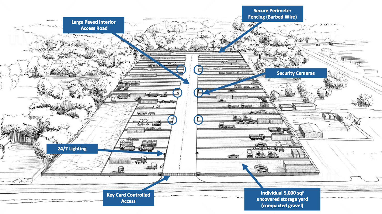 This site will feature 50-75 individual yards ranging from 2,500 to 10,000 square feet, customizable based on tenant demand and on-the-ground feedback. Tenants access their spaces via an interior paved road that connects a mix of gravel laydown areas, all surrounded by fencing, lighting, and electronic access control.