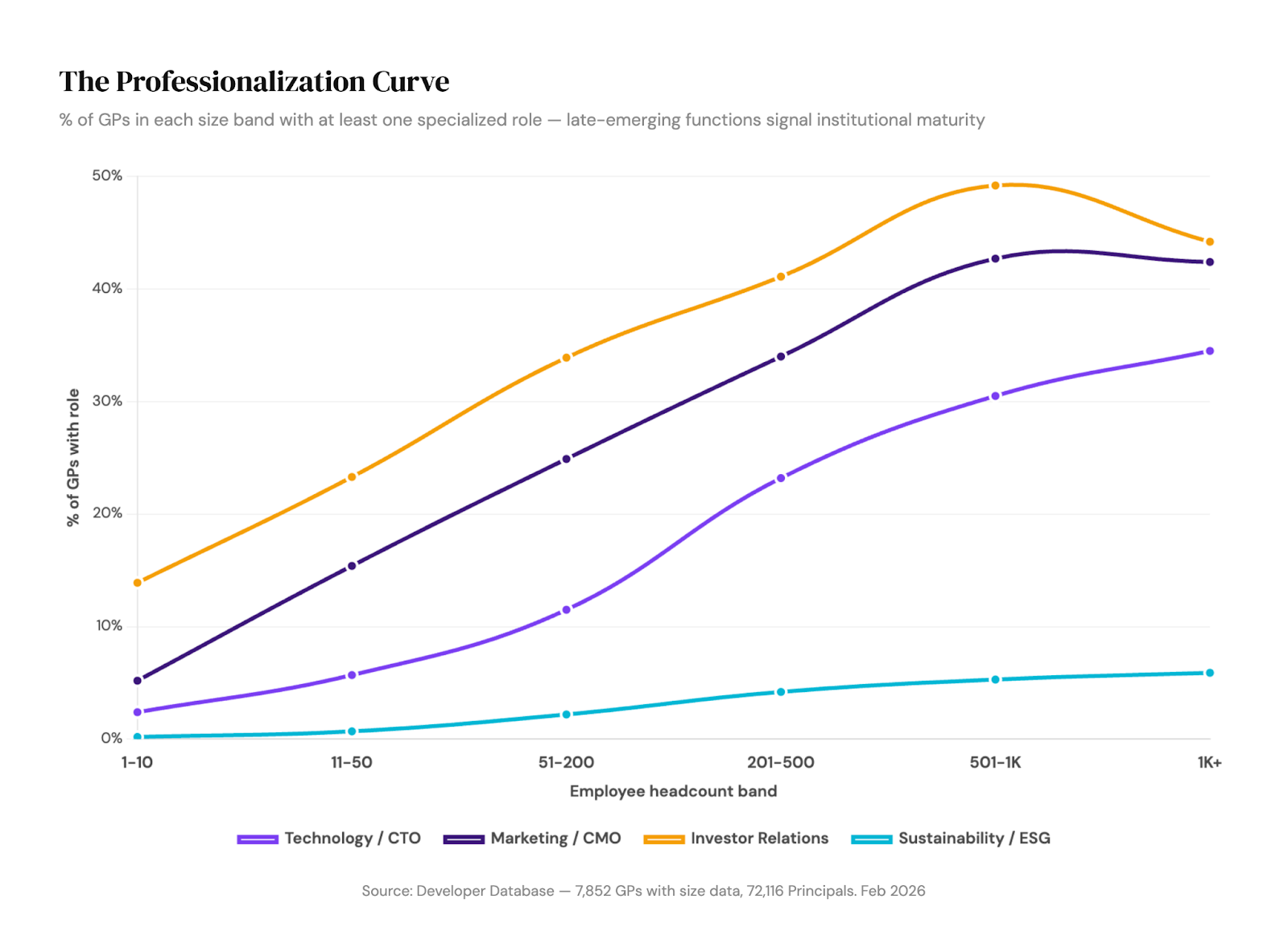 However, getting excited about new tech isn't enough: implementation can be a far more significant challenge and often requires specialized expertise. Our next chart evaluates the presence of these specialized roles – CTO, VP Marketing, IR, ESG – as operators scale.