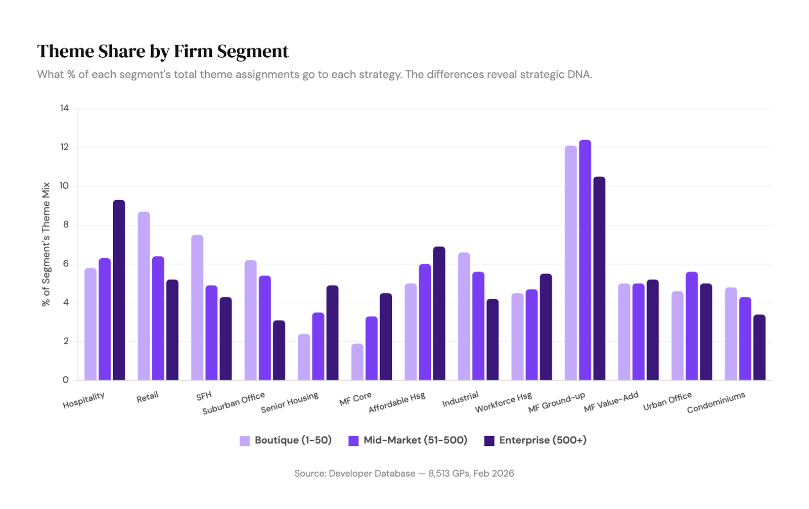 Ground-up multifamily is the great equalizer: 12.1% of boutique firms, 12.4% of mid-market, and 10.5% of enterprise. Building apartments is universal.