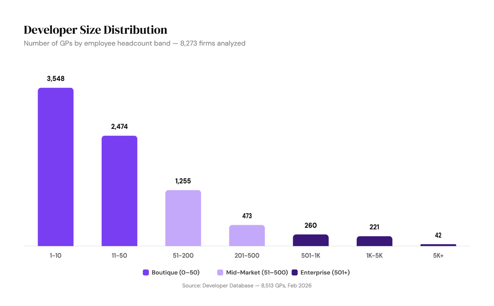 More than 70% of firms have fewer than 50 employees. The long-tail is real, and it's a significant market segment for anybody selling into real estate operators. These aren’t the names you see on NMHC Top 50 lists or CRE conference panels – They’re the two-partner shops building 20 townhomes in a Raleigh suburb, family businesses buying standalone retail properties, and local operators doing one or two ground-up multifamily deals per year.