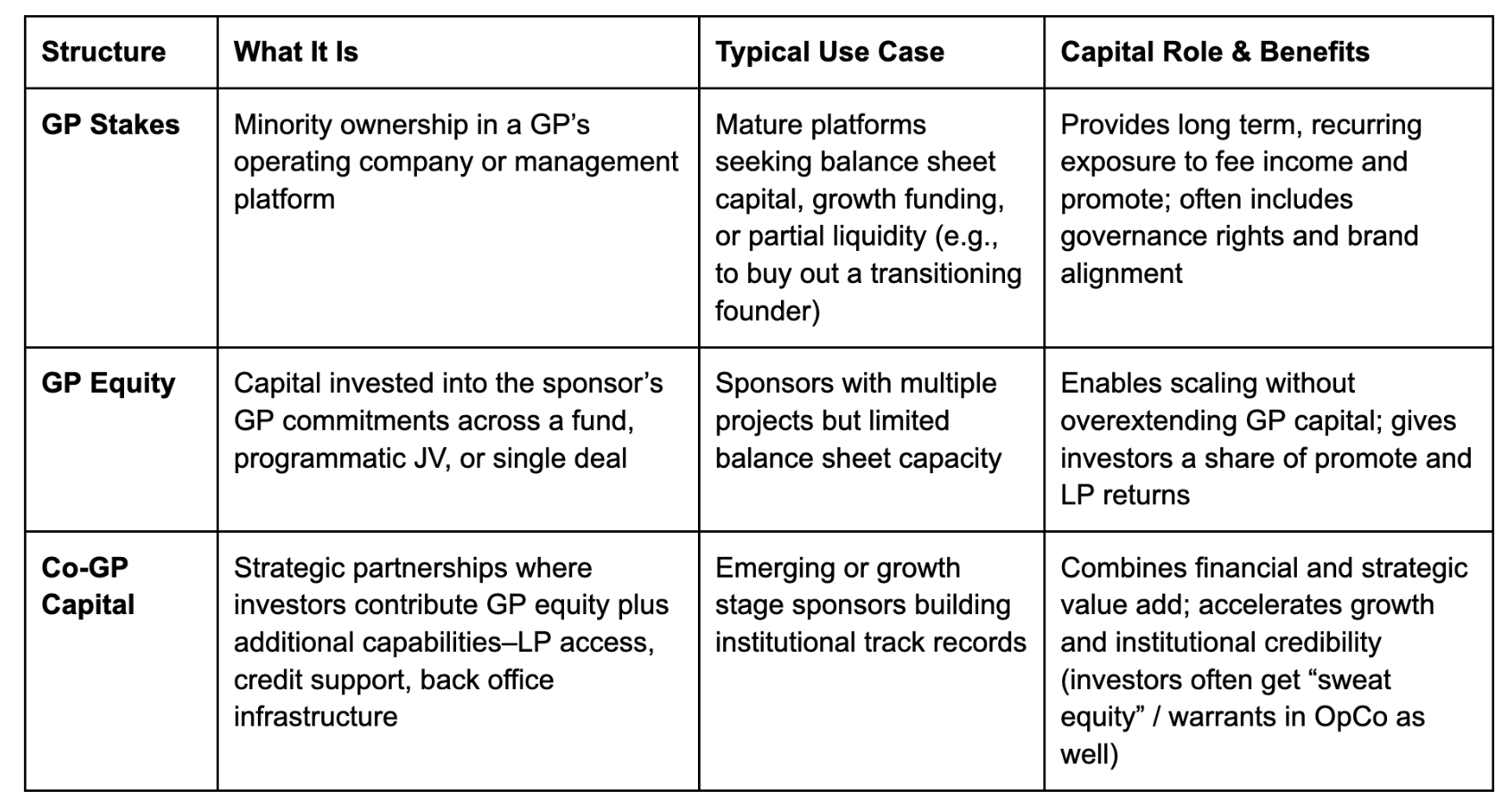 At one end are GP stakes, where investors buy an equity piece of the sponsor’s operating company or management platform (like an investment in any other private company). At the other are co-GP partnerships, where investors join at the deal level, taking an active role in execution. Between them sits GP equity, a flexible structure that funds a sponsor’s GP commitments across multiple projects or funds.