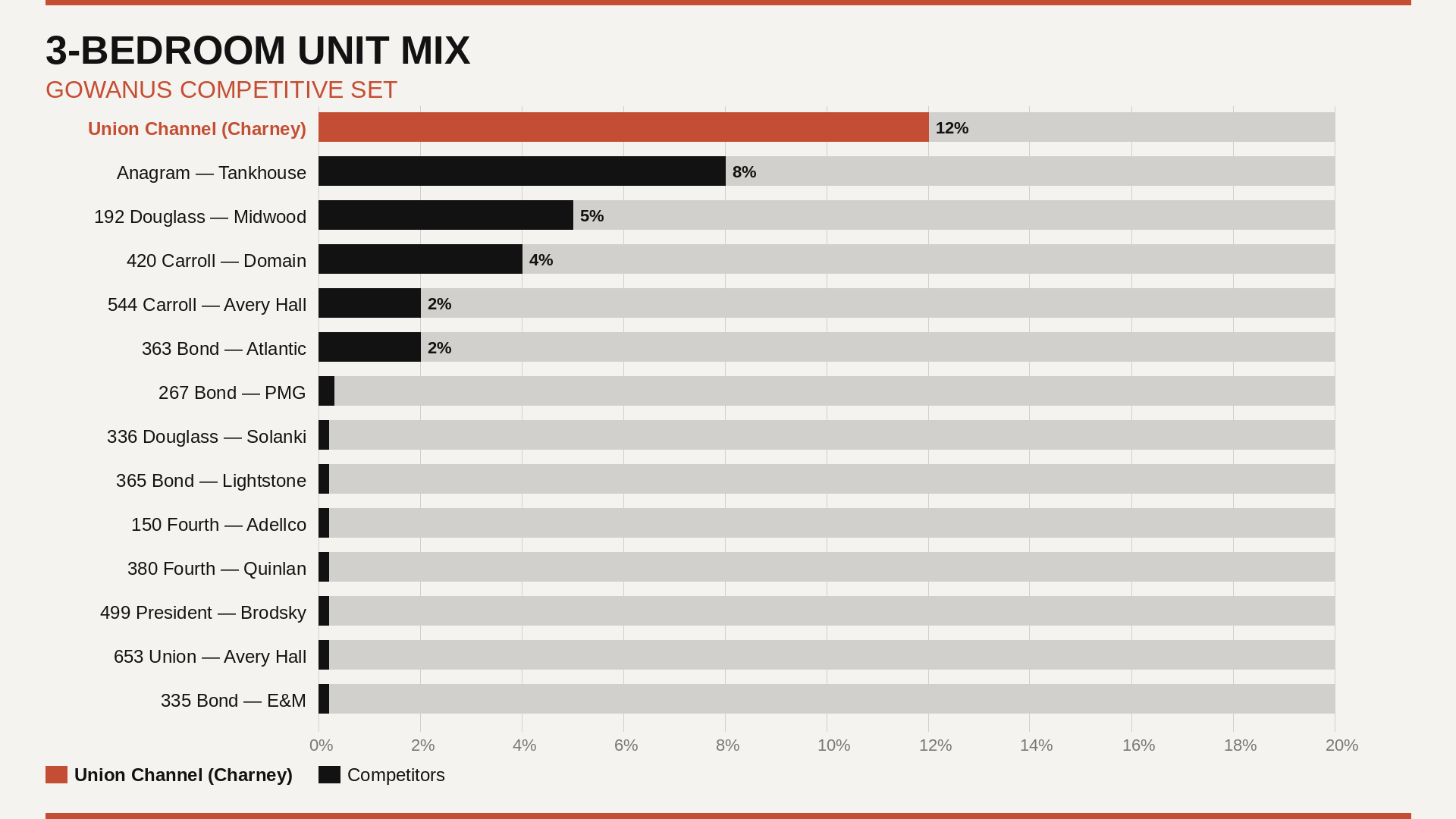 It was a significant gap. Only about 3 percent of existing supply consisted of three-bedroom units, while broader demand analysis pointed to absorption closer to 14 percent. That data was available to every developer and brokerage in the market, but none had acted on it. Union Channel's three-bedroom allocation was more than triple the market average. They were the first unit type to fully lease.