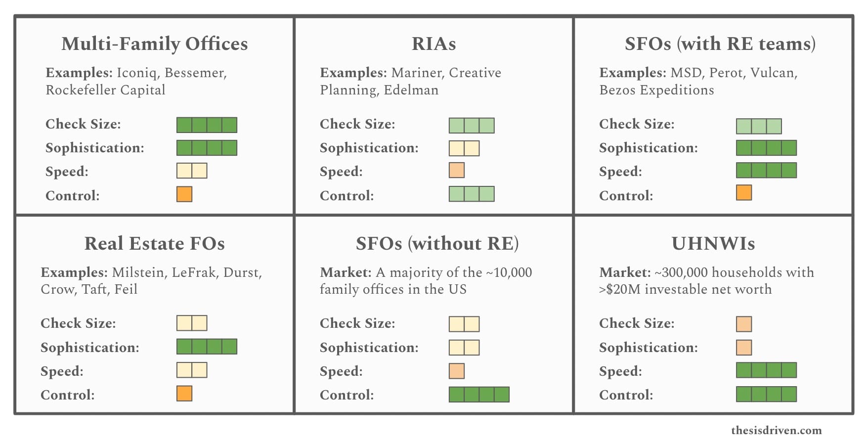 We evaluate and divide family office firms across four dimensions: typical check size, sophistication, speed, and control required: