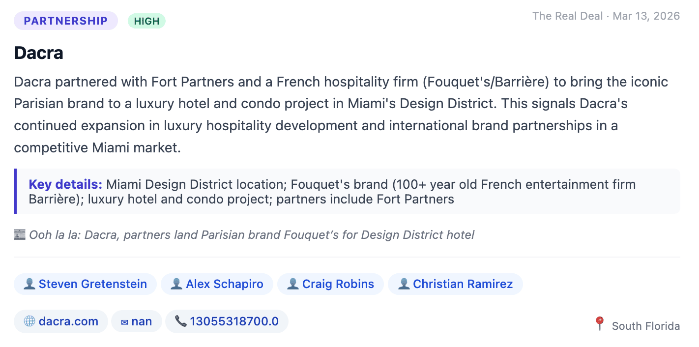 Every morning, we run through more than 1,000 news sources. We scan the entire real estate-related web—including local press, which often flies under sales teams’ radar but carries the best coverage of on-the-ground projects outside major markets—to surface every story you might otherwise miss.