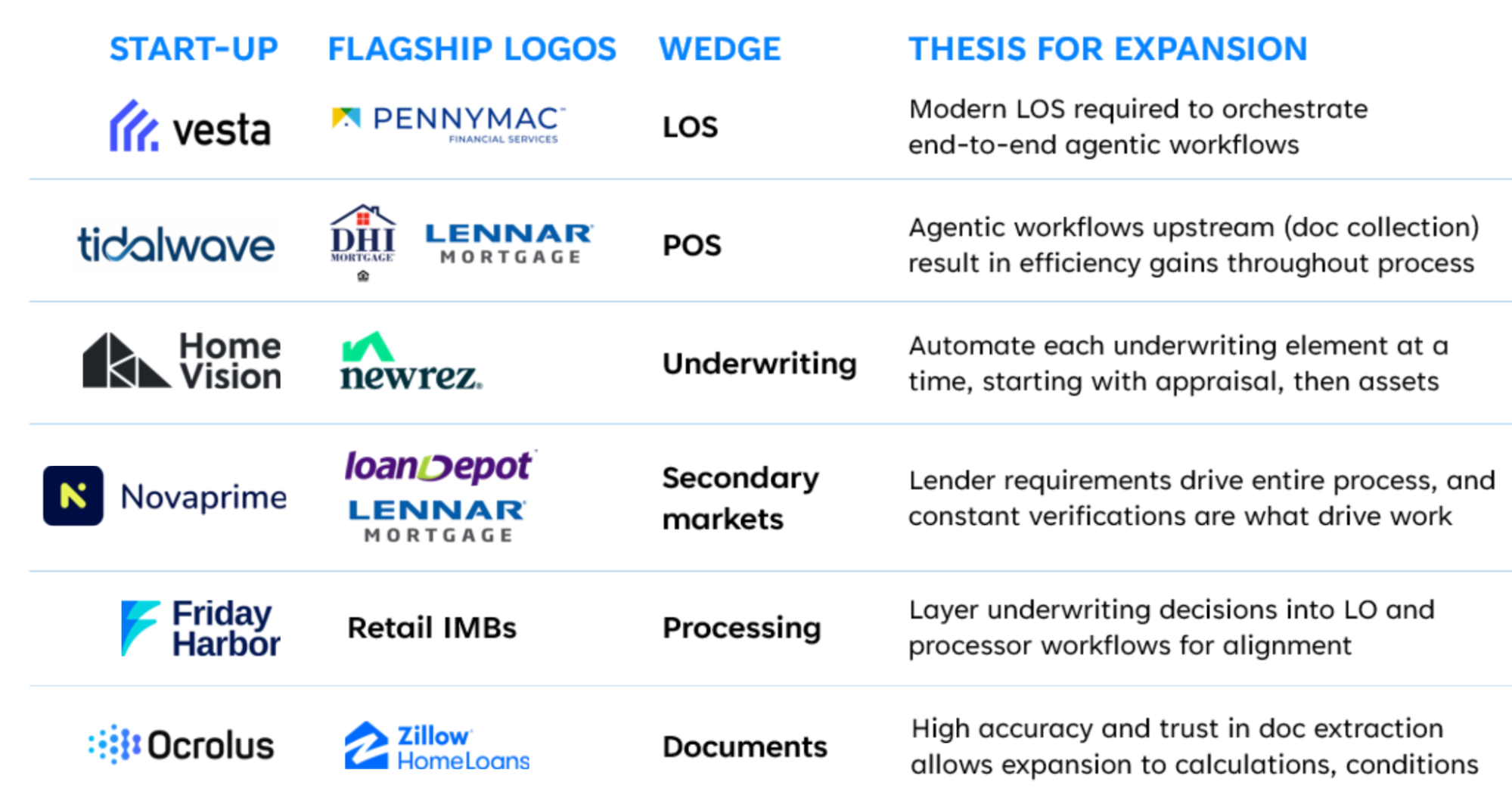 The current wave of startups is notably more experienced than its predecessor. Many are repeat founders who came up through earlier mortgagetech or fintech companies and learned the hard lessons firsthand. That credibility has been enough for major lenders like Pennymac and Newrez to commit early. The key questions remain: how quickly can any startup translate early partnerships into broader acceptance, and how can they earn the right to own more of the process while navigating the incumbent relationships that constrain them. Vesta is the one exception, in outright competition with Encompass rather than uneasy accommodation.