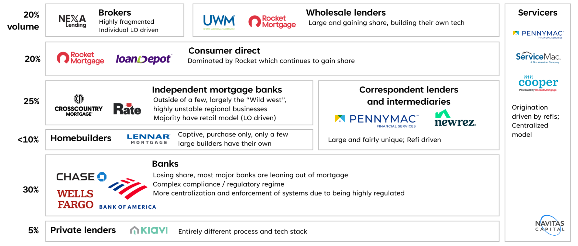 After 2008, traditional banks retreated from mortgage lending. Dodd-Frank's regulatory burdens accelerated that exit, and less-regulated independent mortgage banks (IMBs) filled the void. Where traditional banks had owned the entire value chain from originations to servicing, IMBs carved it into pieces: a broker might own the sale, a specialty lender might underwrite and fund, an intermediary might securitize the pool, and the servicing rights might land with yet another party entirely.