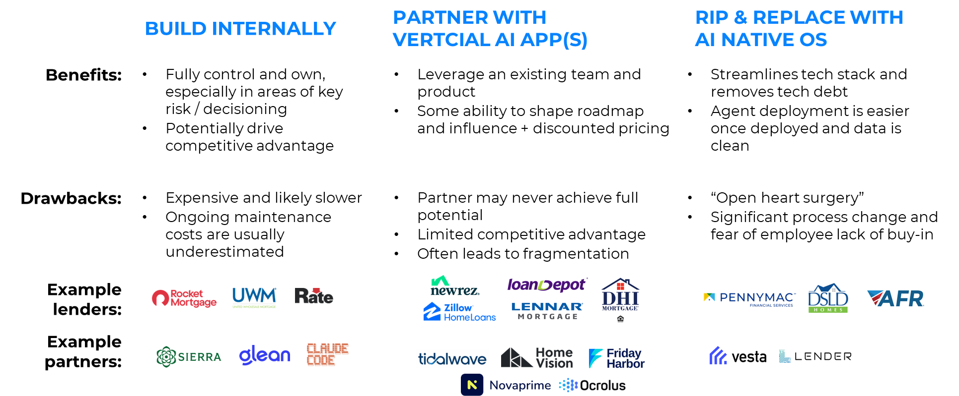 The third approach goes the deepest: uprooting existing systems to replace them entirely with AI-native systems of record. Few lenders attempt it because the organizational disruption can be enormous: it affects the most employees and requires large-scale rewiring of processes. Lenders tend to describe it as open heart surgery.