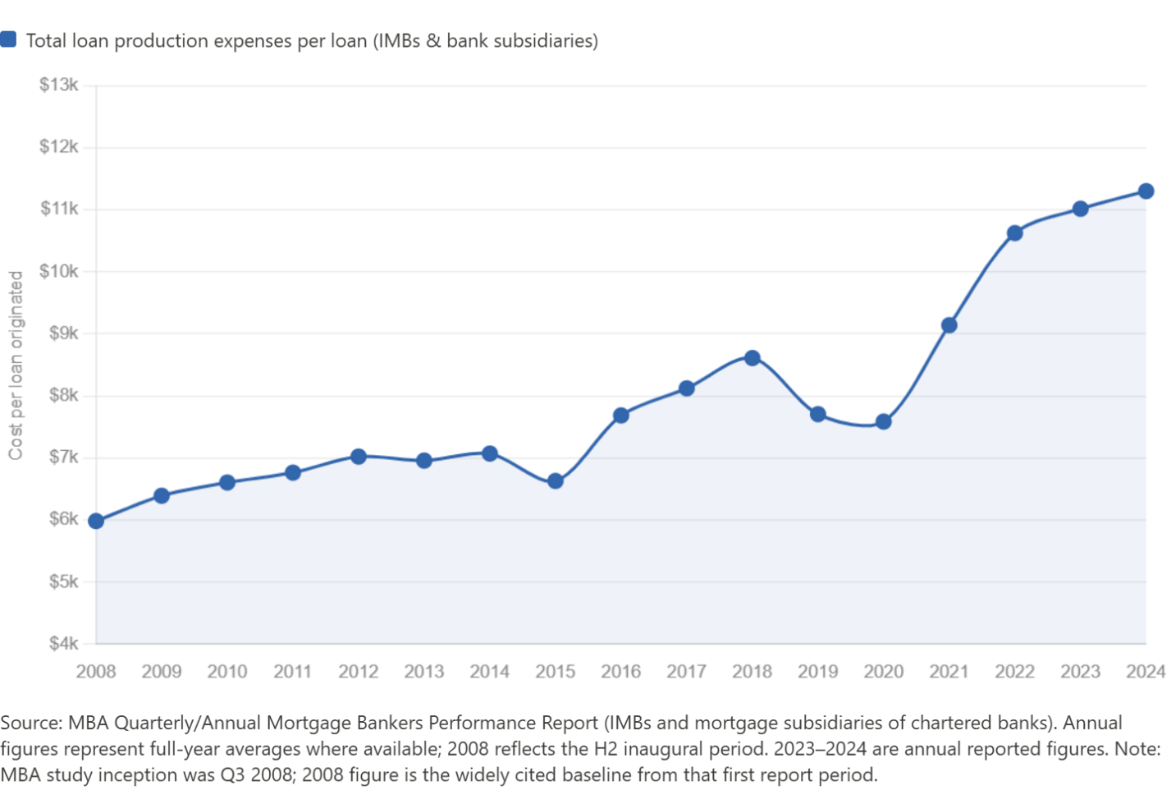 Dozens of other well-funded companies never achieved escape velocity, or were gobbled up by incumbents before fulfilling their visions. The pattern is not unique to mortgage, but the gap between promise and outcome is unusually wide. Industry productivity has only fallen and headcount has remained stubbornly high.